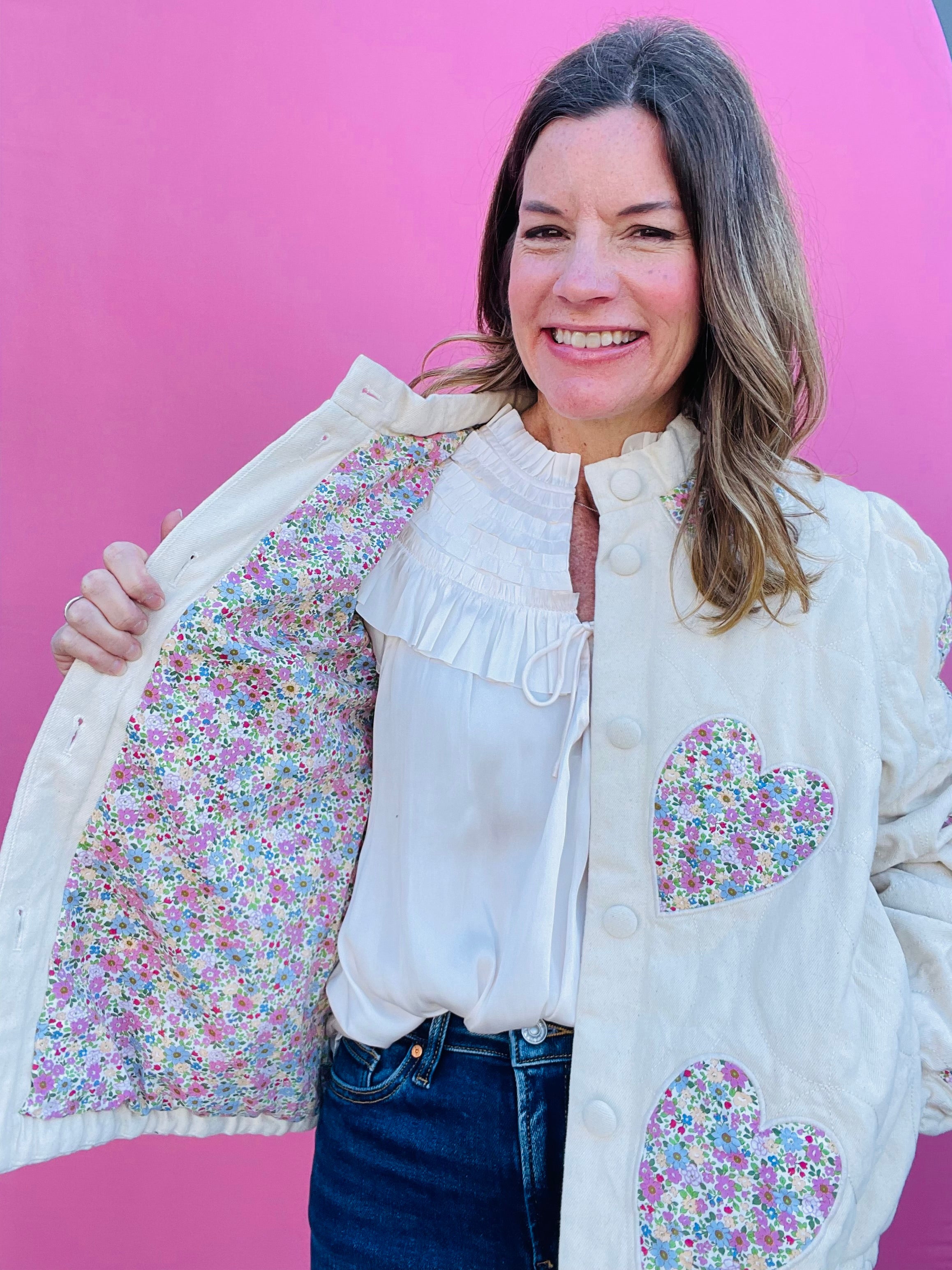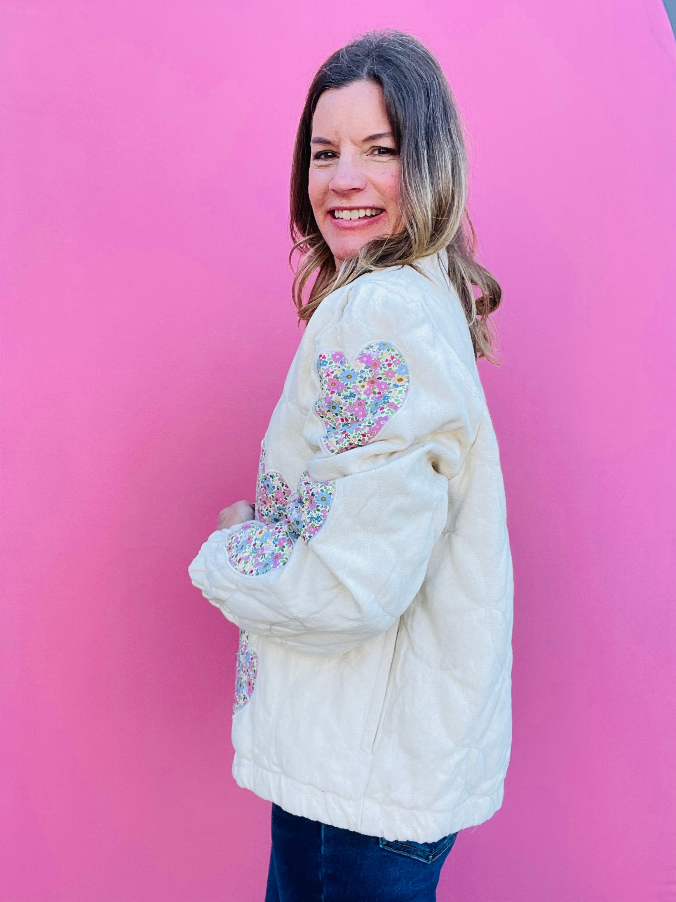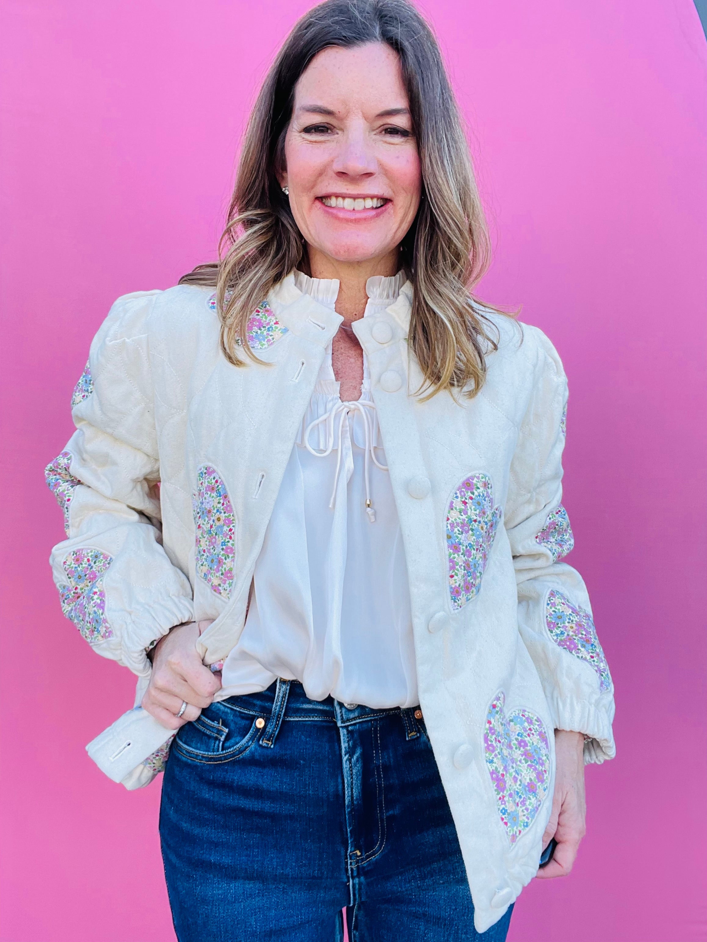 This timeless piece boasts delicate floral quilted hearts, adding a touch of romance to any outfit. Perfect for adding a touch of elegance and sophistication to your wardrobe.