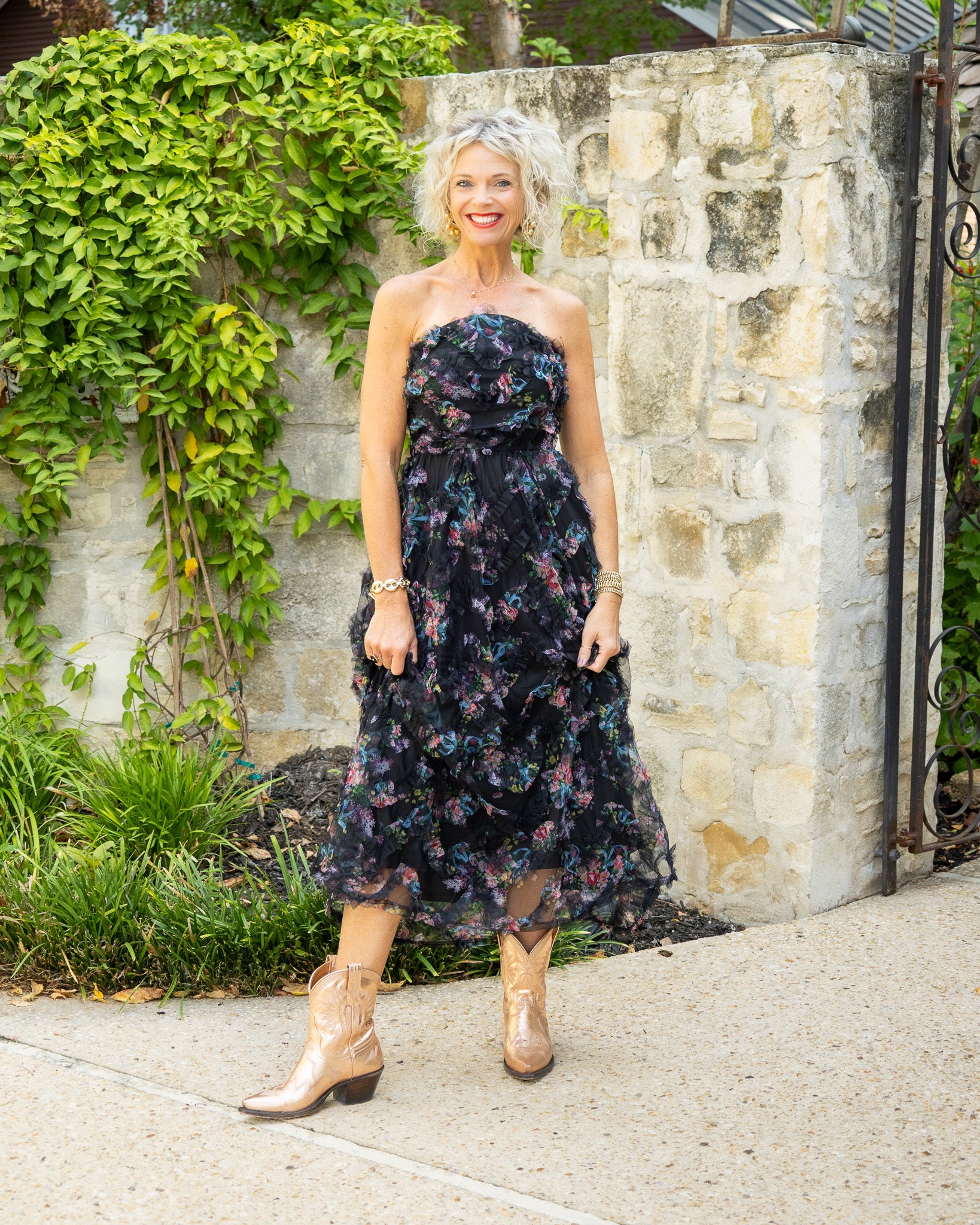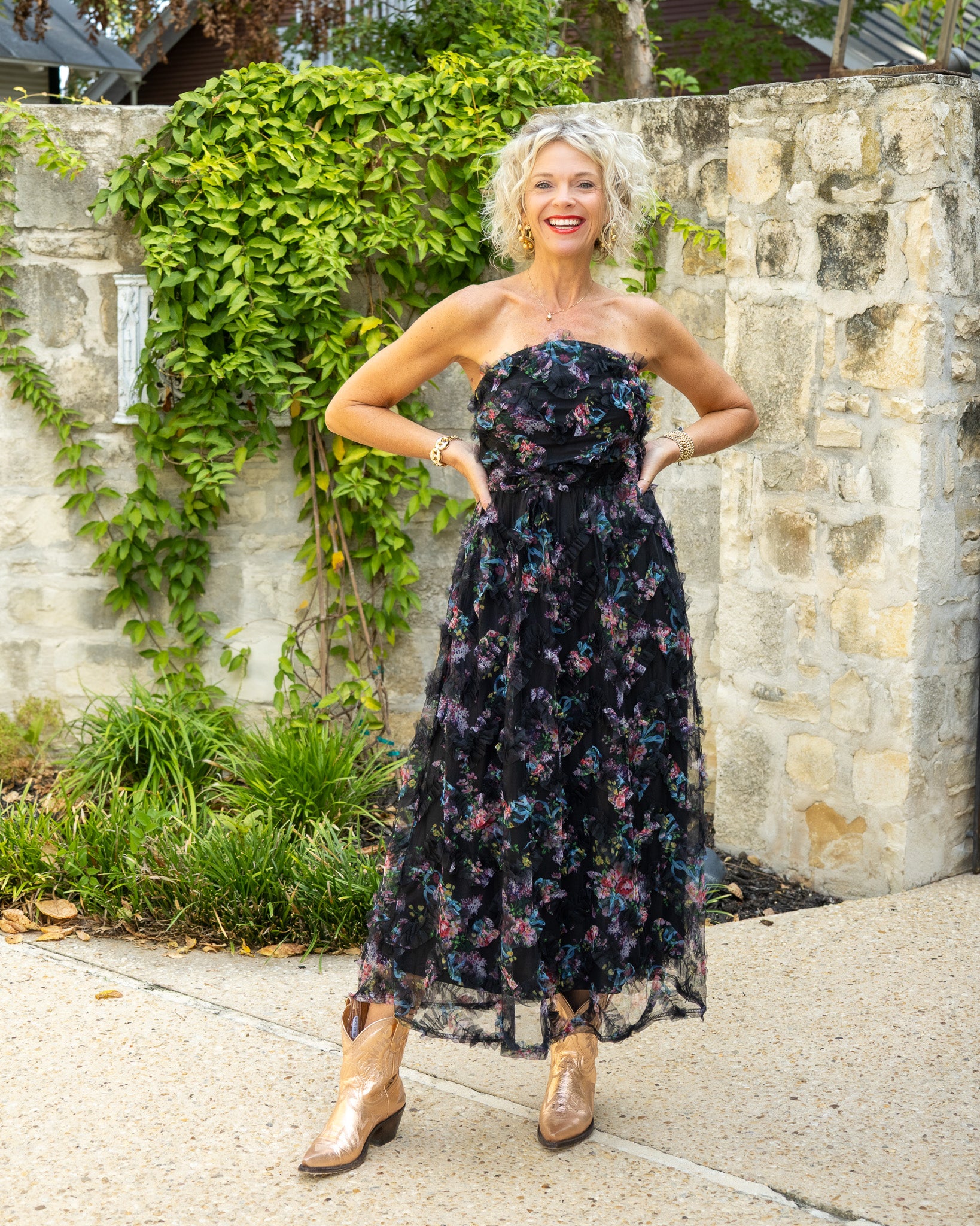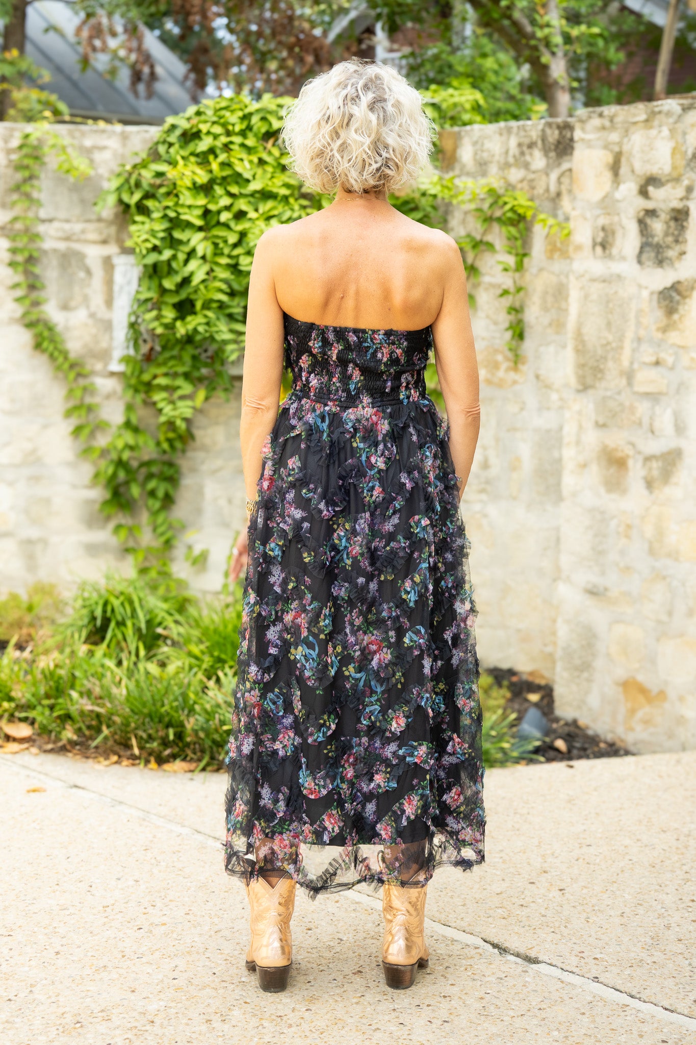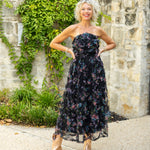 Float into romance with the Whisper Bloom Maxi Dress. This strapless black floral tulle beauty blends delicate blooms with airy layers, creating a dreamy, playful vibe perfect for twirling through special moments.