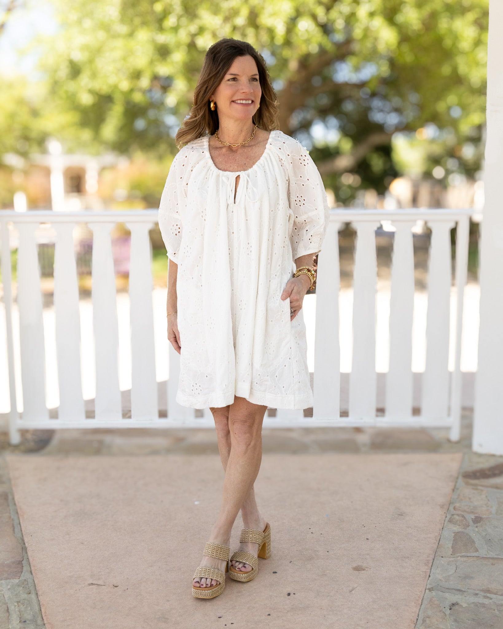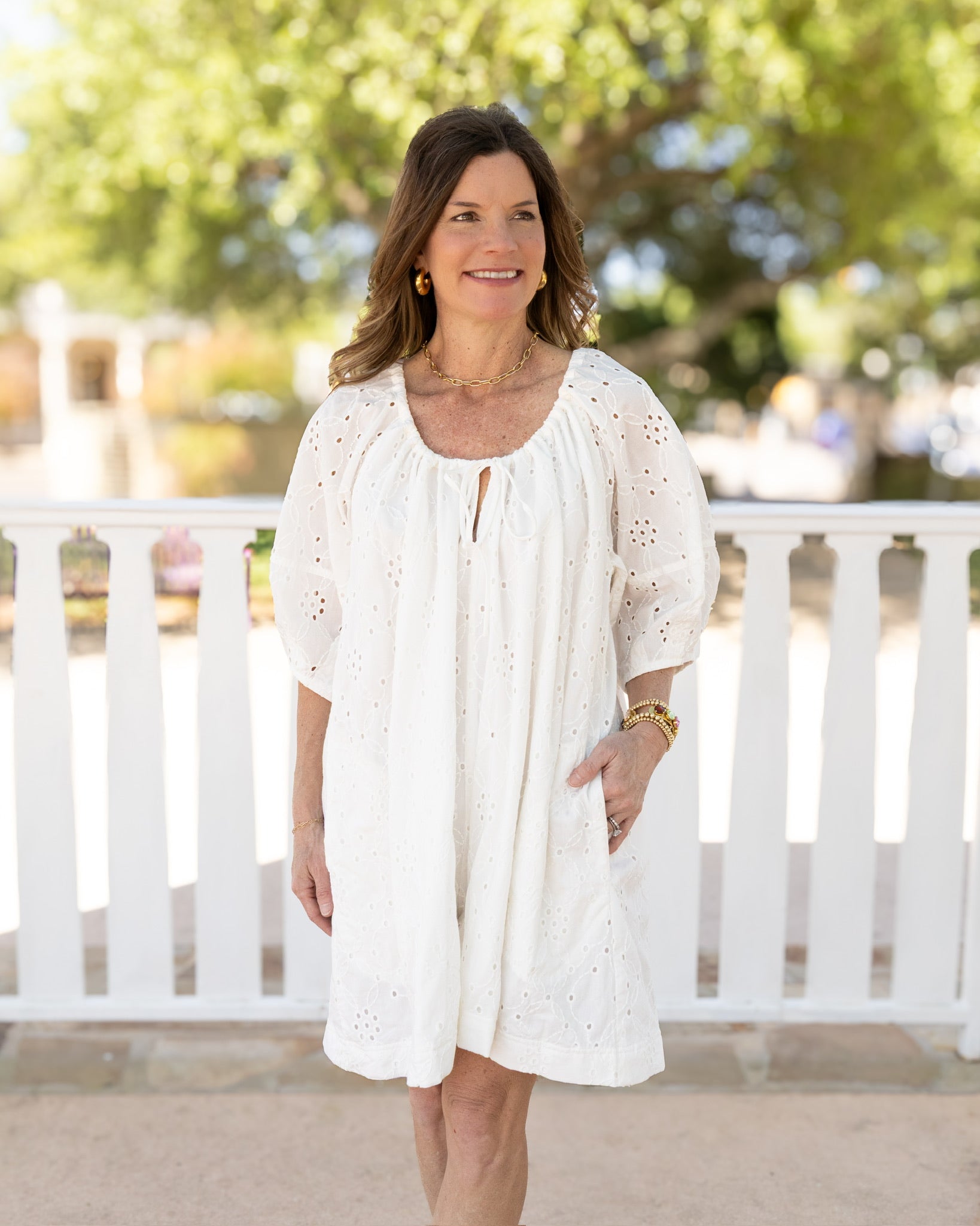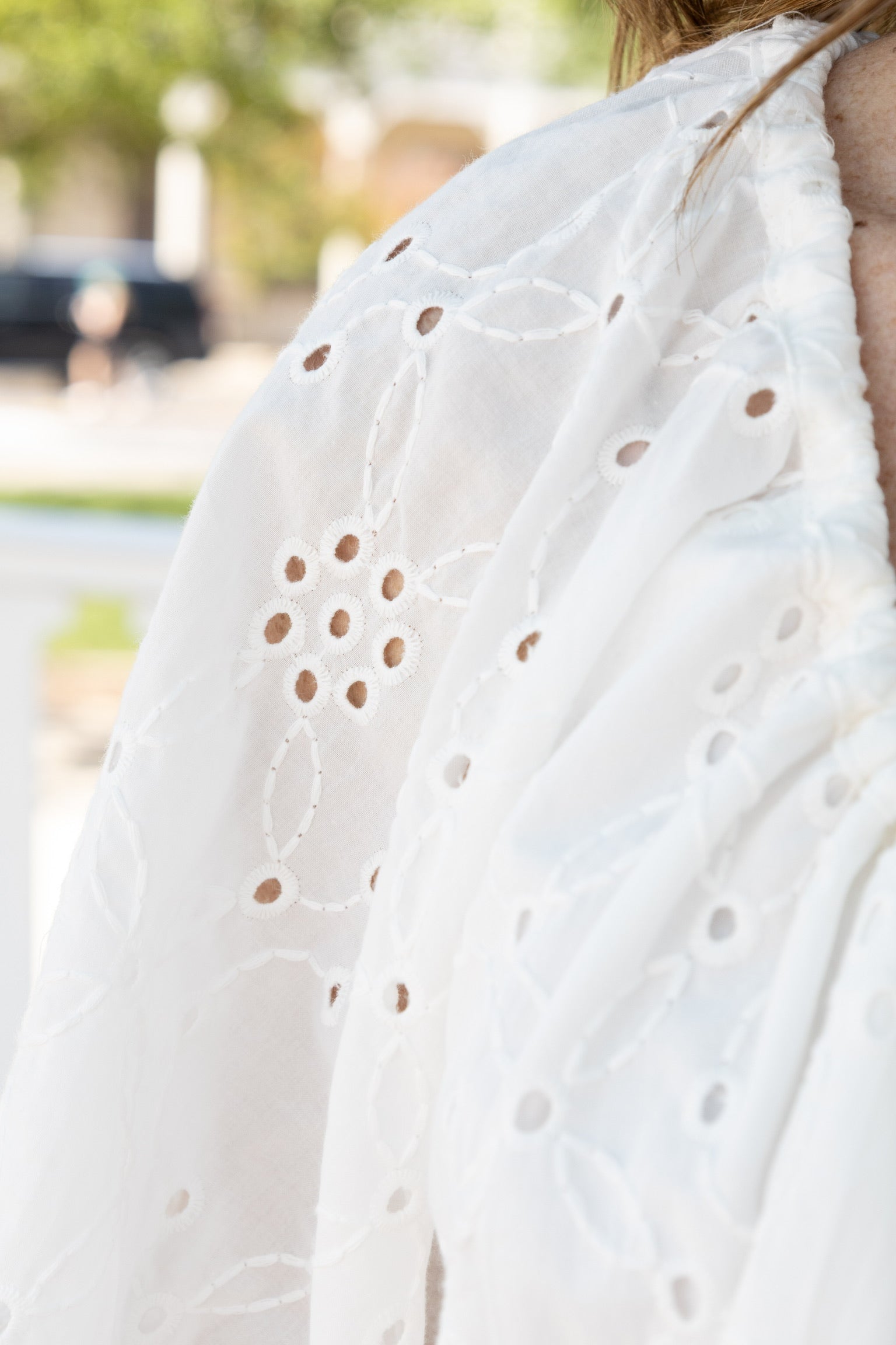 Get ready to romp around in style with our White Cotton Eyelet Romper! This playful, oversized romper features a billowy fit and short sleeves, making it perfect for those hot summer days. The white eyelet design adds a touch of whimsy and will keep you cool and comfortable. So why not add this fun romper to your wardrobe? You won't regret it!