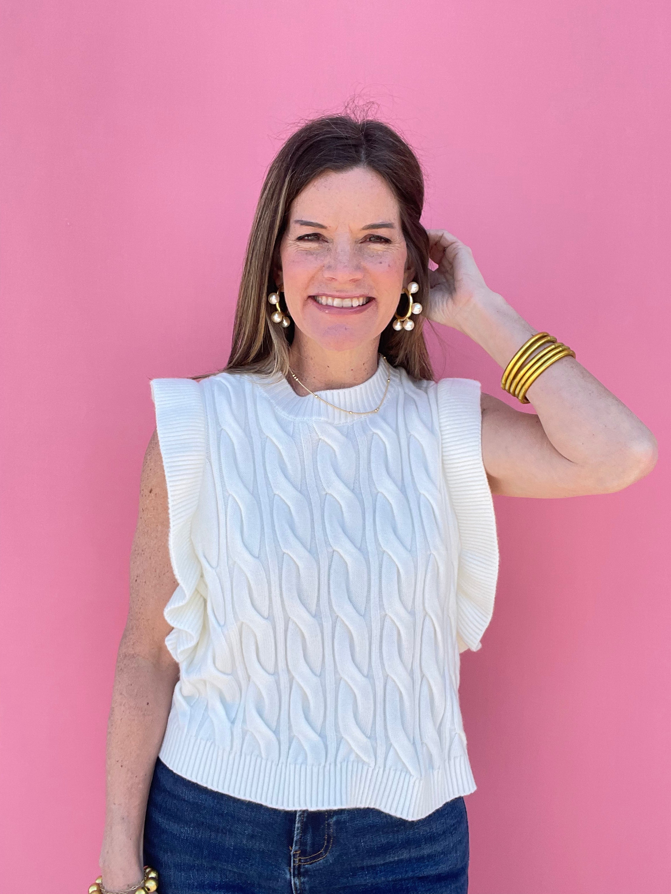 Stay cool and stylish with our white sleeveless sweater! With ruffle cap sleeves, this sweater adds a touch of playfulness to any outfit. Perfect for warmer days, this sweater is the ultimate combination of comfort and fashion.