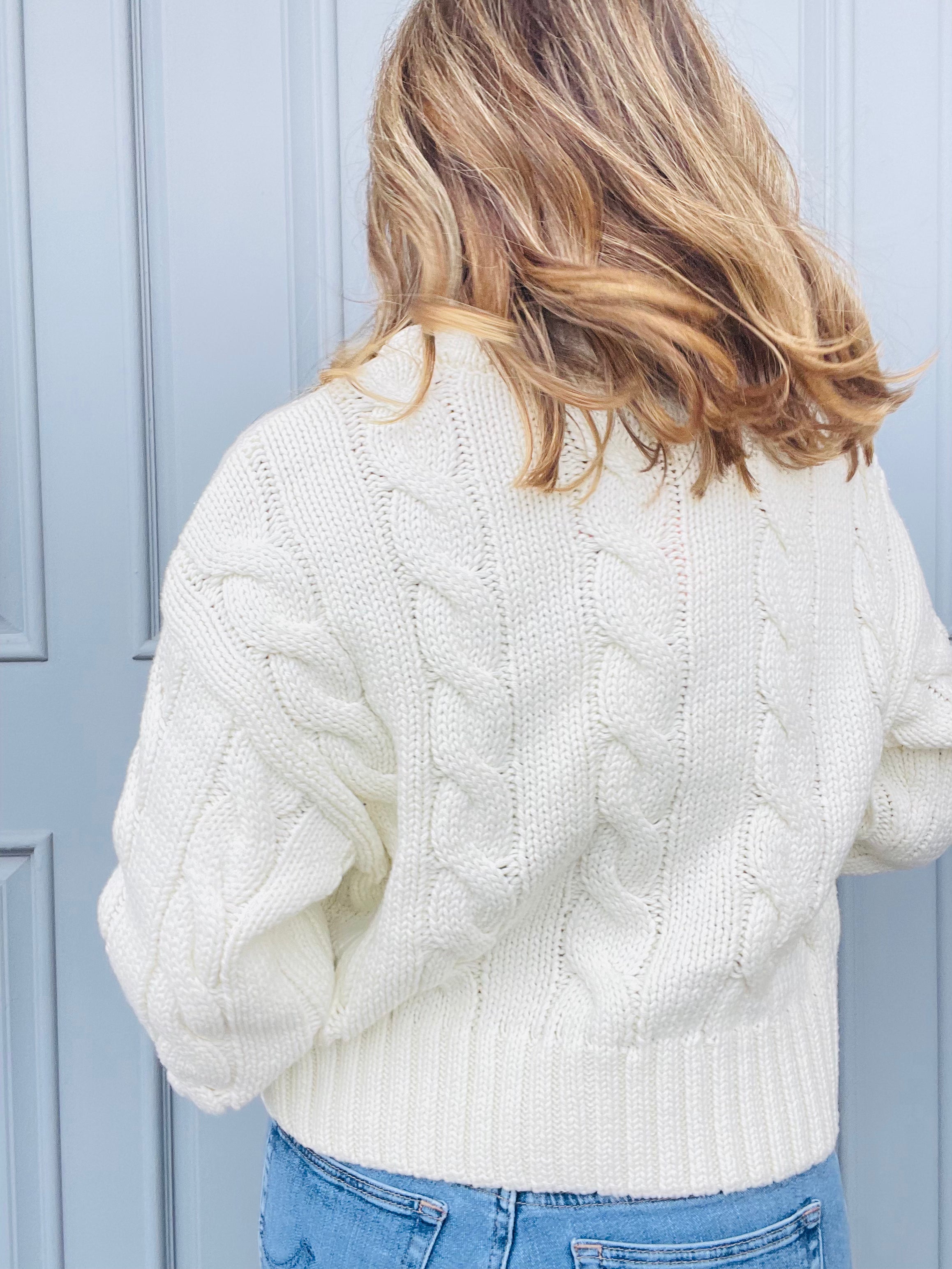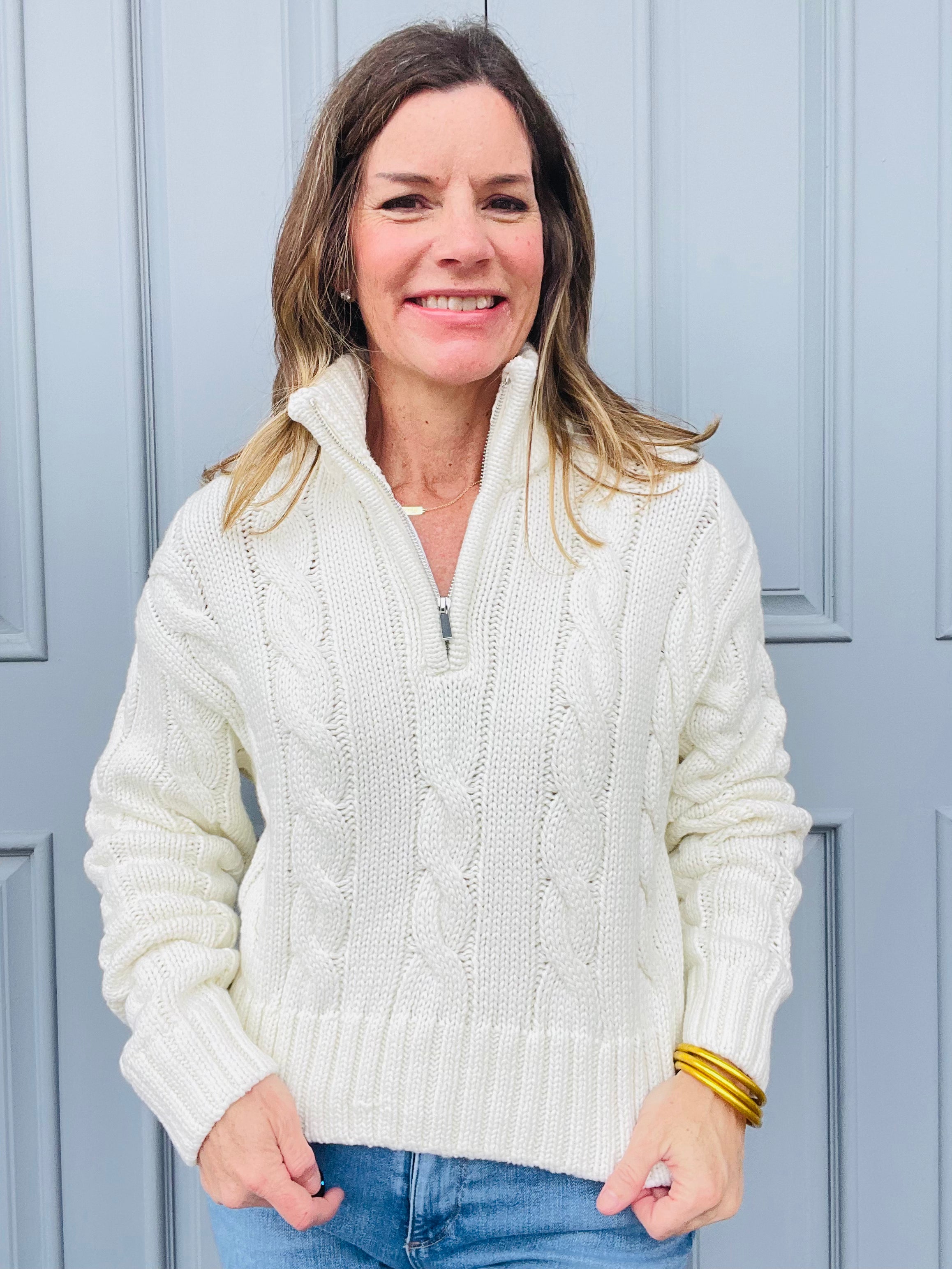 Say goodbye to chilly weather with this unique White Zip Cable Sweater. Perfect for any occasion, this sweater features a warm mock neck to keep you cozy and stylish. (And it's the perfect excuse to skip out on any outdoor activities you weren't feeling anyway.)