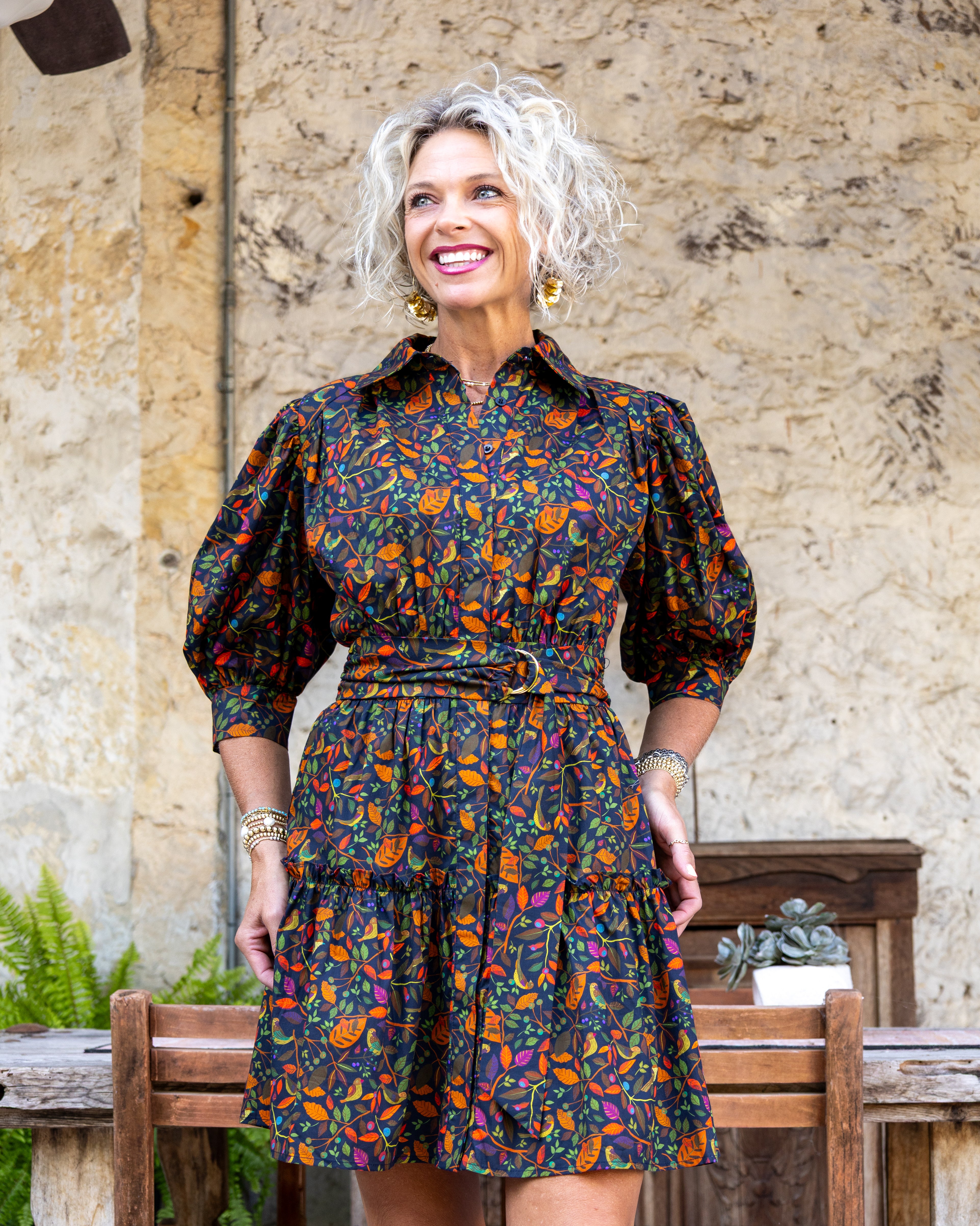 Embrace the cozy charm of fall in the Winter Garden Mini Dress. This navy beauty blooms with warm autumnal florals, featuring a playful button-down front and a crisp collar. The belted waist adds a flattering touch, while 3/4 sleeves keep it comfy and stylish for brisk days.