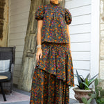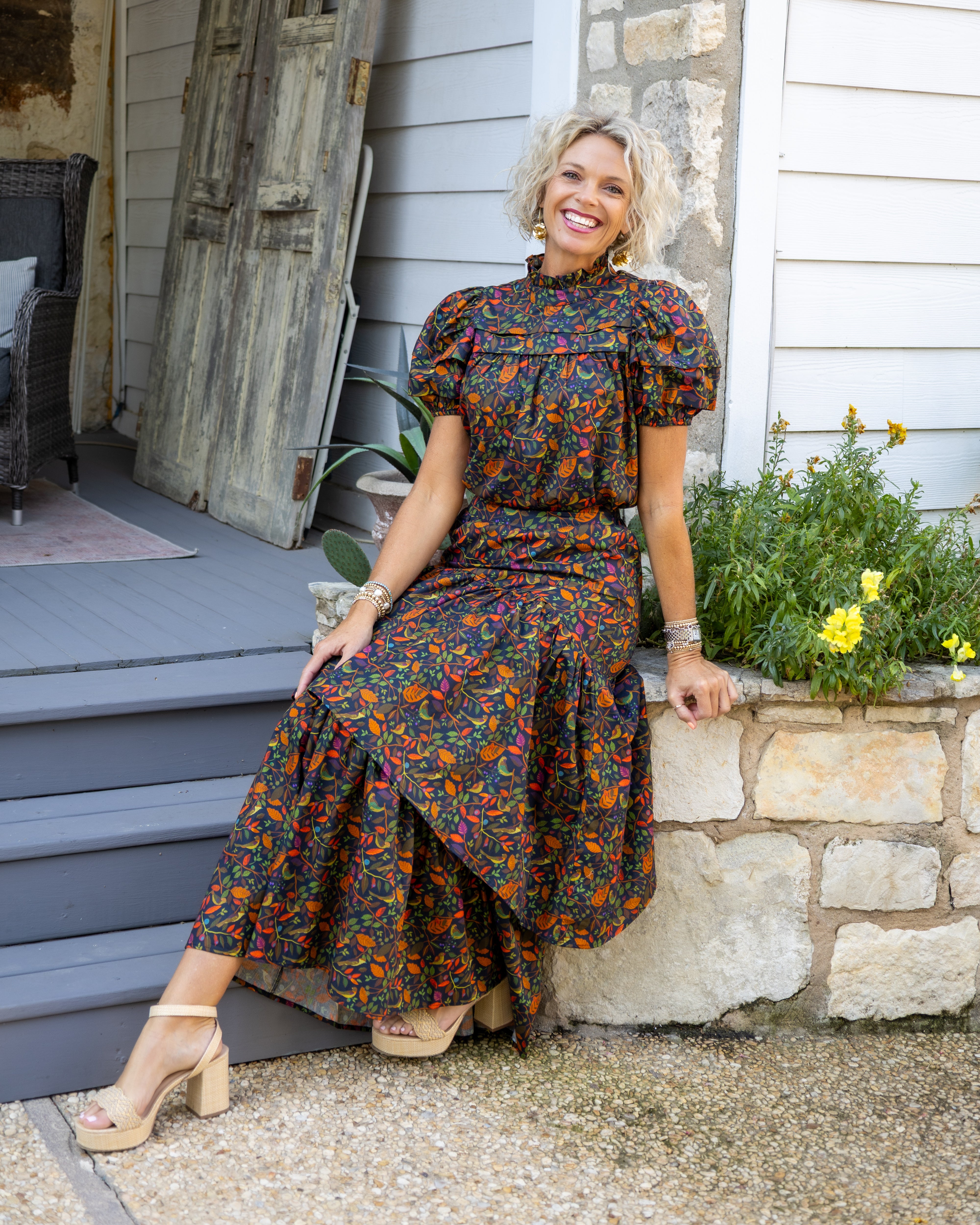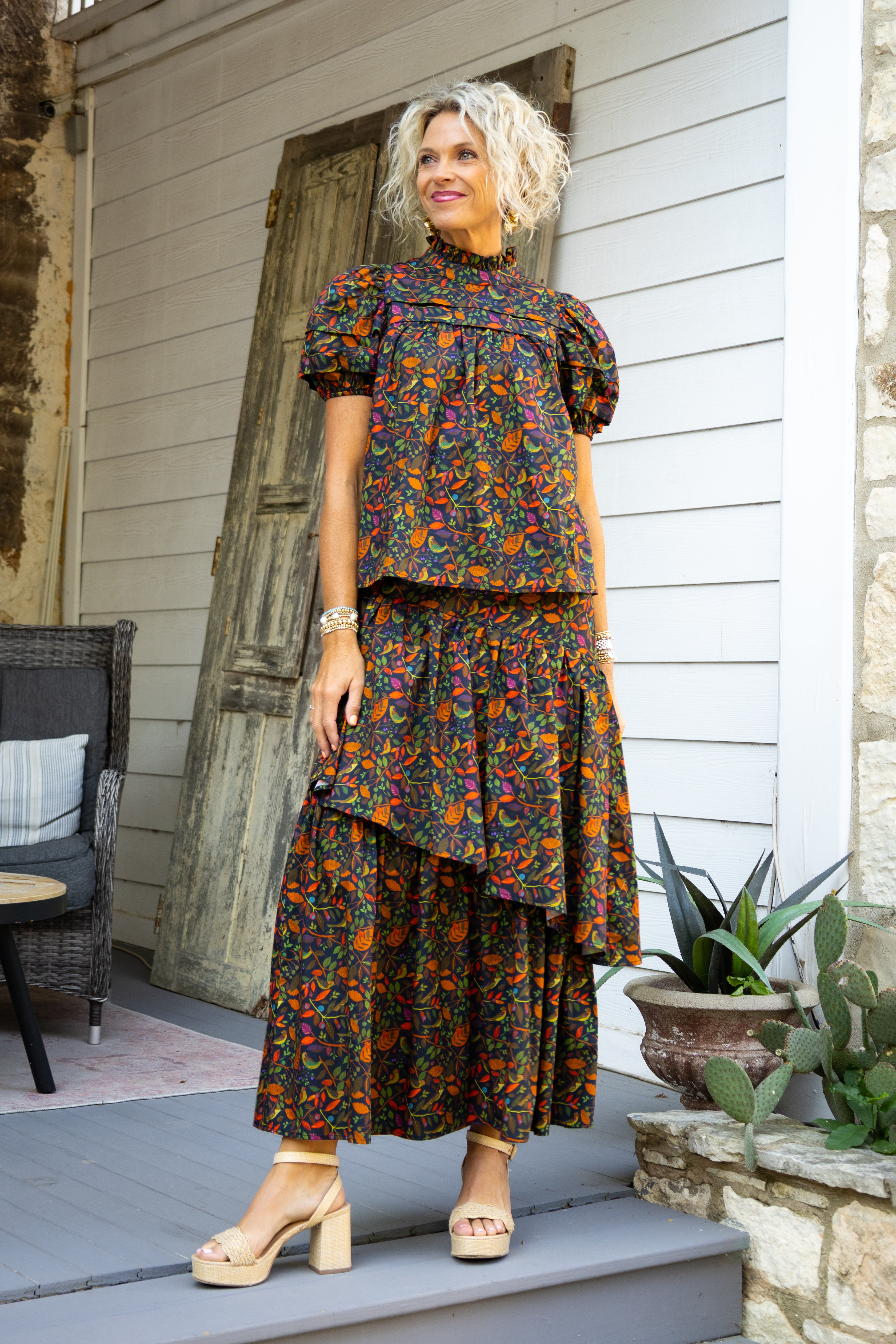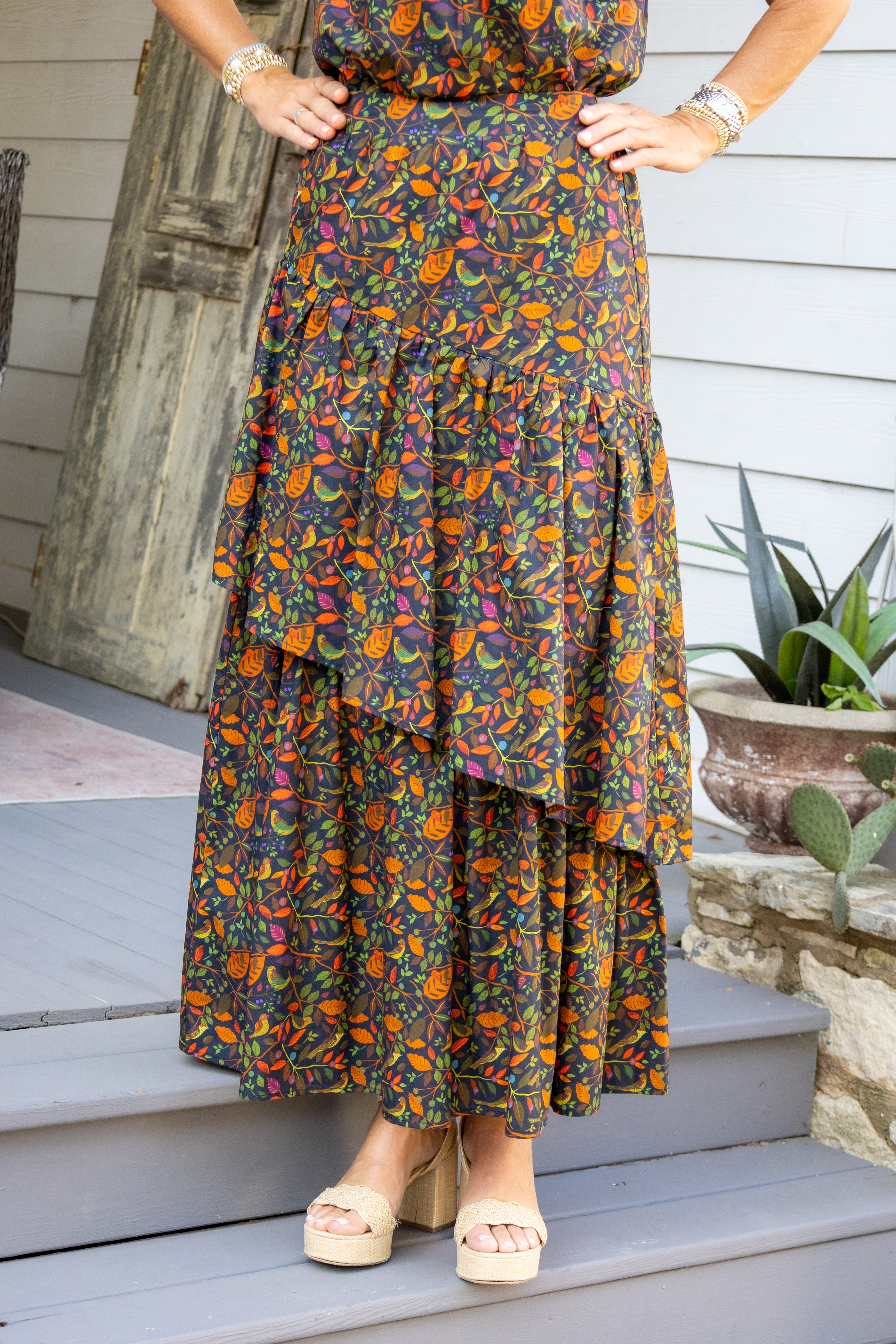 Bring a splash of seasonal charm to your wardrobe with the Winter Garden Skirt. This tiered midi skirt features a playful navy base adorned with vibrant fall-colored florals, perfect for embracing cooler days in style. Its flowing tiers add movement and flair, making every step feel light and fun.