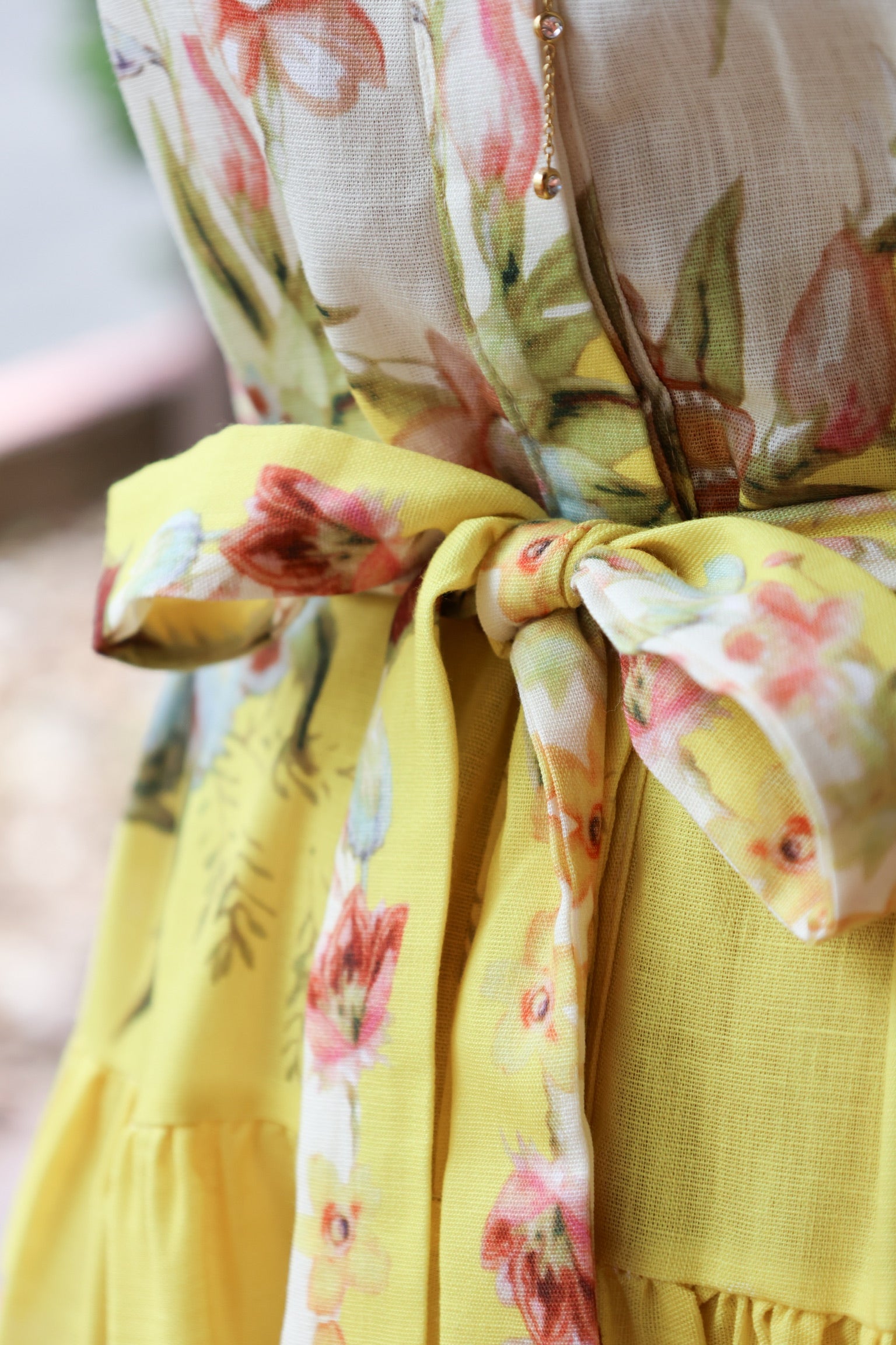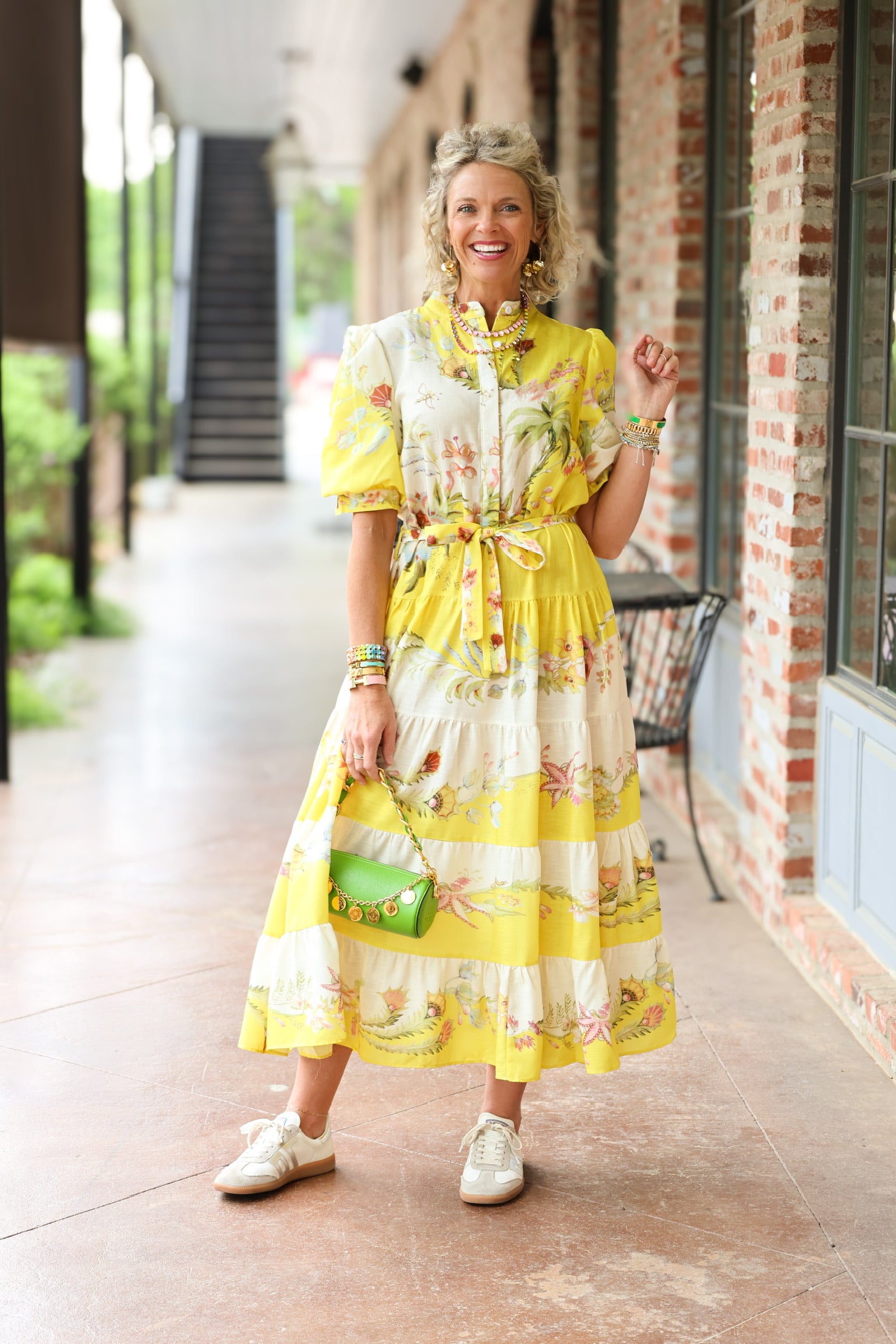 Get ready to turn heads in this stunning Yellow Floral Maxi Dress. With its vibrant watercolor floral pattern, 3/4 sleeves, and a waist-cinching sash, you'll feel confident and stylish wherever you wear it. The button-down design adds a touch of charm to this must-have dress. Make a statement with this playful piece!